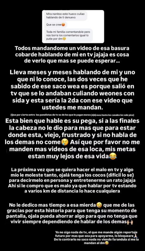 Molesto por las palabras del periodista, Nano escribió: “Todos mandándome un video de esa basura cobarde hablando de mí en TV. Es cosa de verlo, qué más se puede esperar. Lleva meses y meses hablando de mí y uno que ni lo conoce, las dos veces que he sabido de ese saco de huea es porque salió en TV que se lo andaban culi… huevones con sida y esta sería la segunda con ese video que ustedes me mandan”, lanzó con evidente enojo.