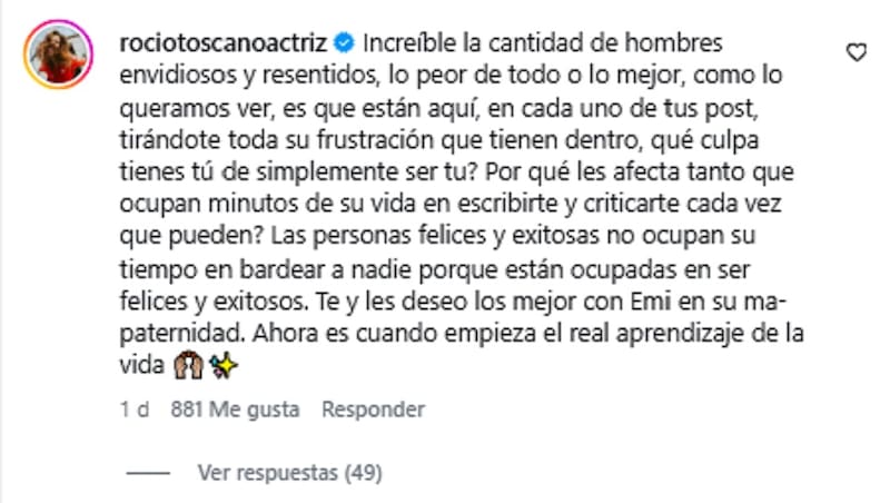 “Increíble la cantidad de hombres envidiosos y resentidos”, escribió la actriz que defendió a Reyes por la ola de “hate”. “Lo peor de todo o lo mejor, como lo queramos ver, es que están aquí, en cada uno de tus posts, tirándote toda su frustración que tienen dentro”, añadió.