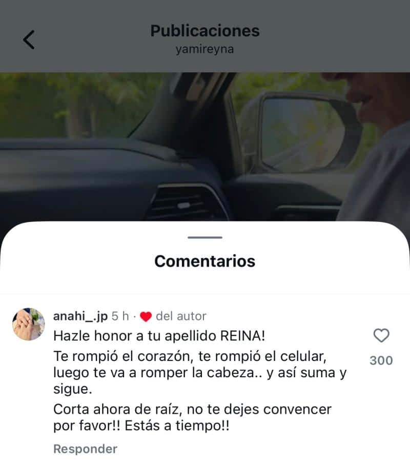 Uno de los mensajes que llamó la atención fue: “Hazle honor a tu apellido, REINA! Te rompió el corazón, te rompió el celular, luego te va a romper la cabeza… y así suma y sigue. Corta ahora de raíz, no te dejes convencer por favor estás a tiempo”, comentario que recibió el “me gusta” de la actriz.