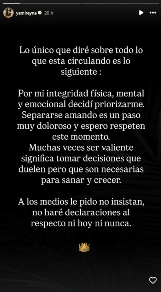 En ese mismo mensaje, dejó establecido que no se referirá públicamente a los detalles del quiebre, optando por resguardar su proceso lejos de los micrófonos.