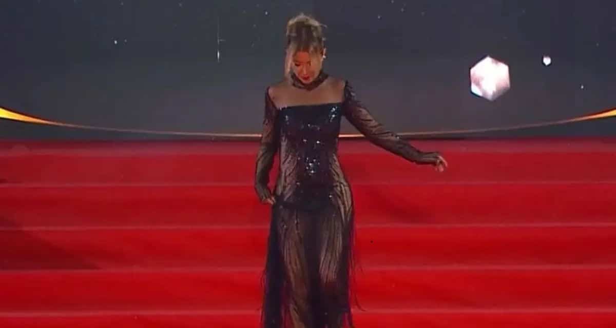 La actriz estuvo a punto de caer al suelo, pero logró afirmarse a tiempo y evitar un accidente mayor, continuando su recorrido ante la mirada atenta de los presentes.